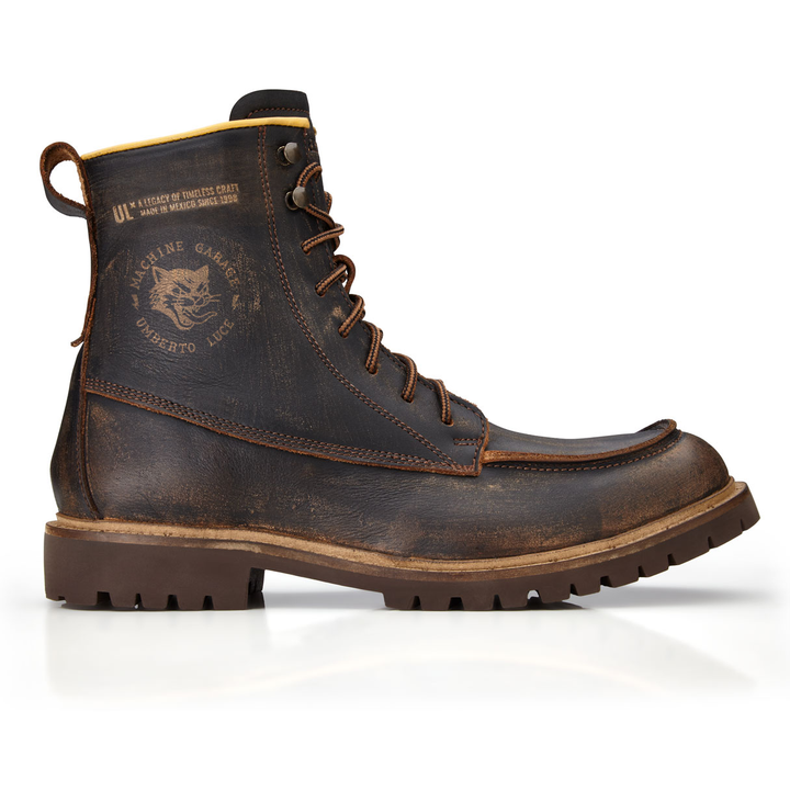Las MG nacen de la colaboración entre Machine Garage y Umberto Luce, uniendo diseño atemporal, artesanía mexicana y protección de alto nivel. Hechas 100% de piel de res en color walnut brown, ofrecen seguridad reforzada con protección D3O® en tobillos, puntera y talón blindados contra impactos, además de una construcción robusta cosida a mano para resistir kilómetros de asfalto.