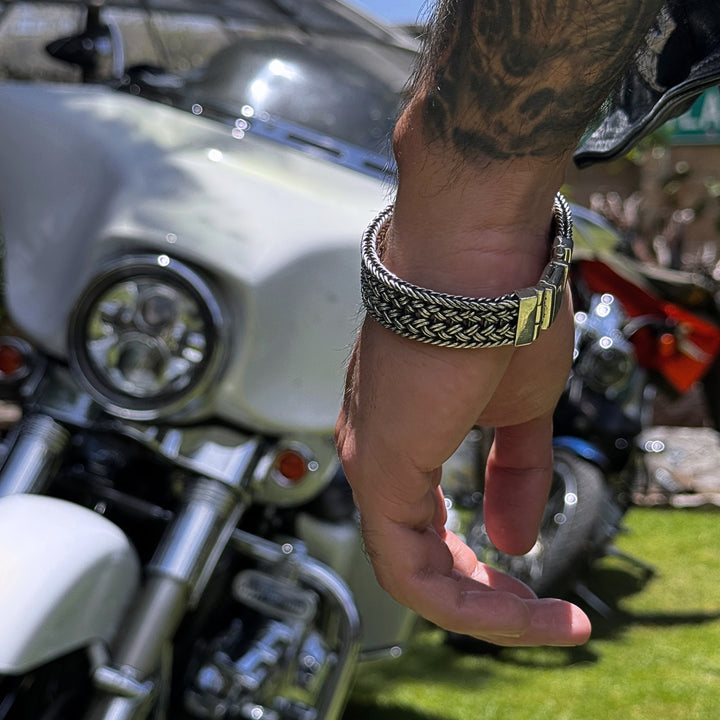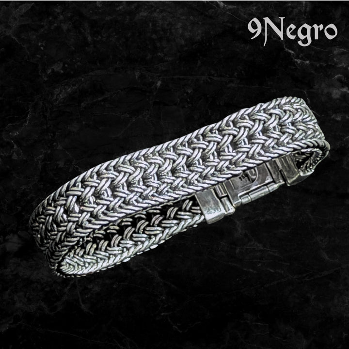 La Trenzado 97 es una pieza imponente que combina precisión artesanal con una presencia audaz. Su patrón denso y plano, inspirado en antiguos tejidos de guerra, transmite estabilidad, protección y poder interior.