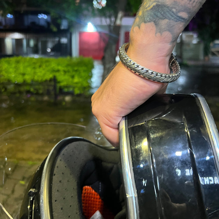 La Víbora 98 lleva un diseño que evoca la textura de escamas en movimiento, como un símbolo de agilidad, instinto y transformación constante. Su forma continua y uniforme le da un estilo sobrio pero con una fuerza visual innegable.
